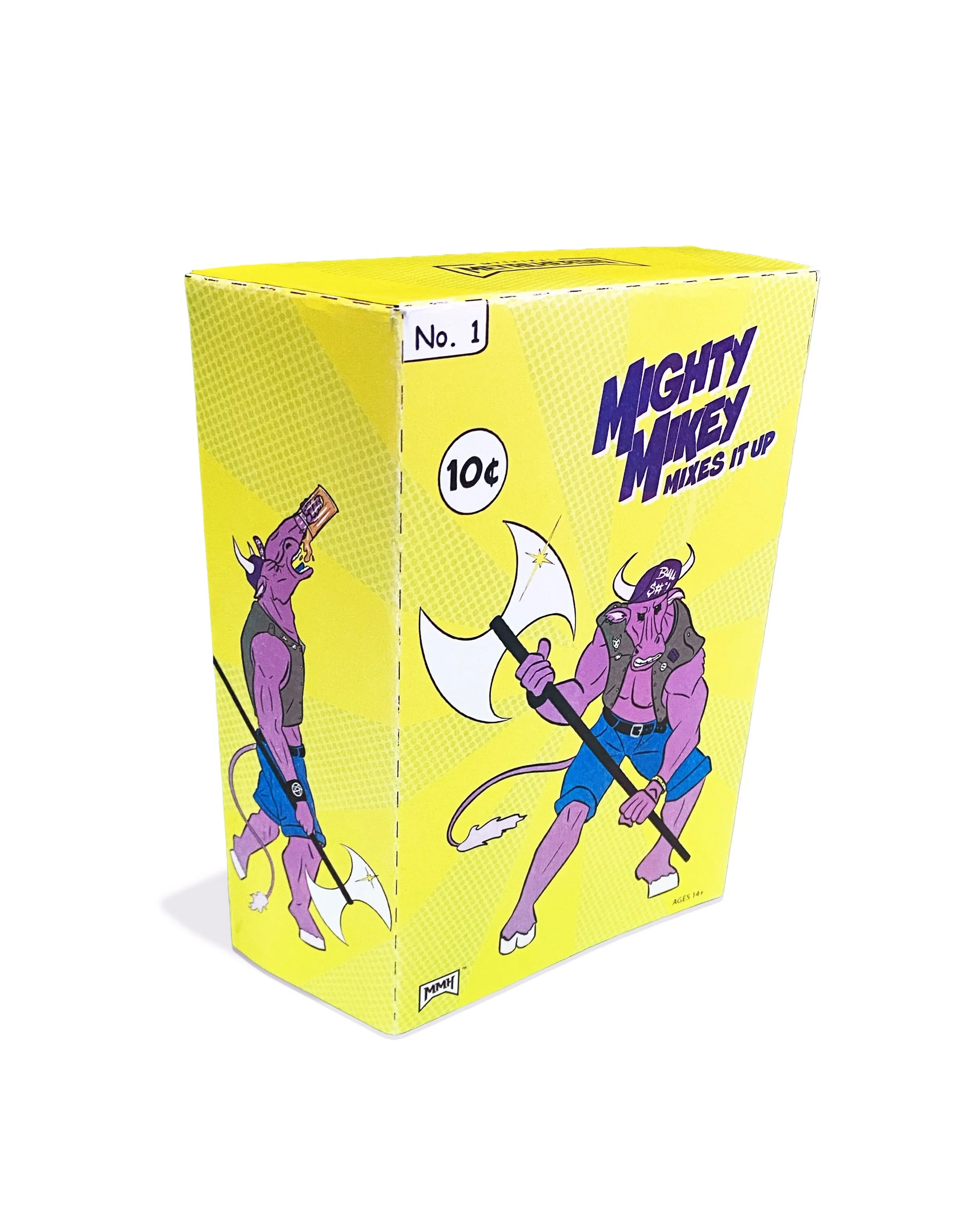 A toy box, sleeve, and insert design for the Mythikal Metalheads, based on vintage comic book art. The sleeve depicts a fight sequence between Mikey the Minotaur and Theseus. The box contains comic panels relating to Mikey and his fellow Metalheads and the back contains a romance copy based off Superman’s about. This project took 5 weeks to complete.