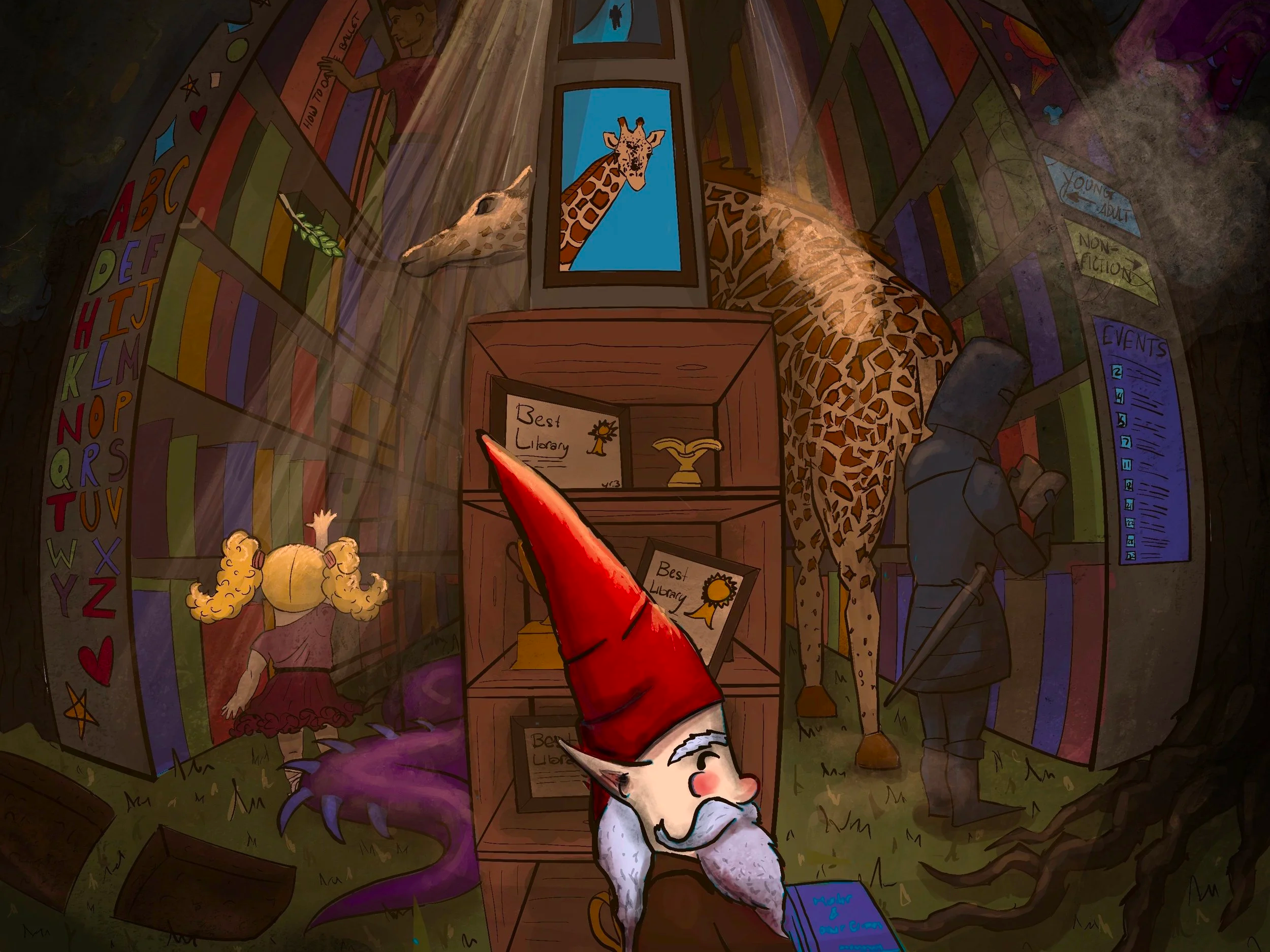 A poster designed for the children’s section of a public library, using characters inspired by a broad range of children’s interests to be inclusive to all interests. The style is inspired illustrated children’s books and artwork already in the library. The perspective is meant to add to the expansive feeling of the library. This piece took 3 weeks from ideation to completion.